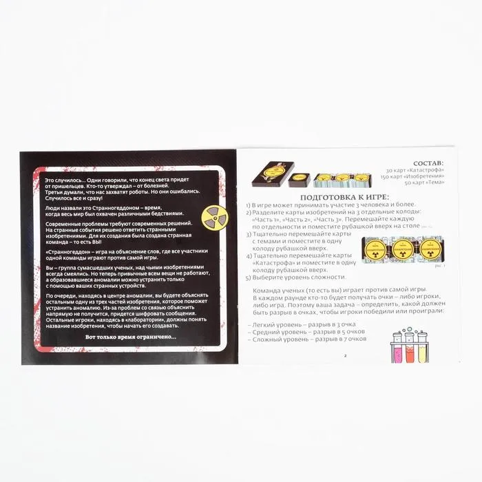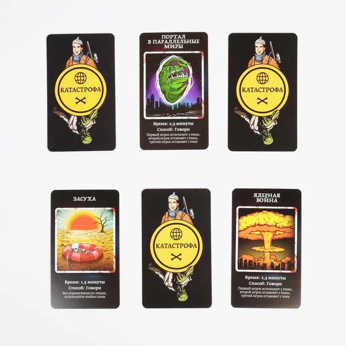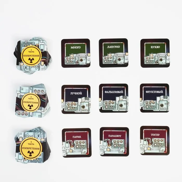 Для начала разделите карты изобретений на 3 отдельные колоды: «Часть 1», «Часть 2», «Часть 3». Перемешайте каждую по отдельности и поместите рубашкой вверх в центре стола. Тщательно перемешайте карты с темами и поместите в одну колоду рубашкой вверх. Перемешайте карточки «Катастрофа» и поместите в одну колоду рубашкой вверх.