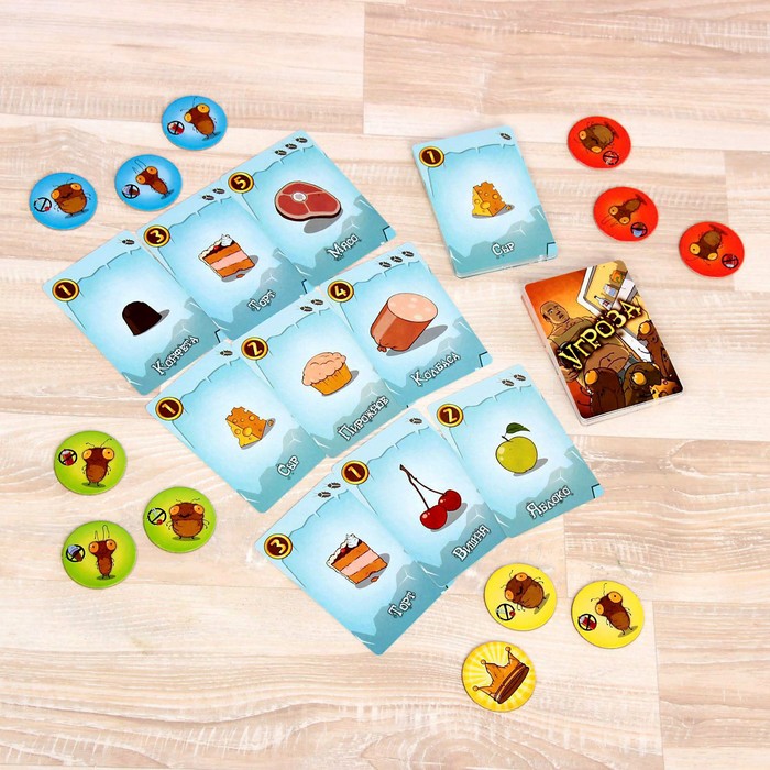 Перед началом каждого раунда на столе выкладываются карты еды в 3 ряда по 3 карты. Это холодильник, на который будут совершать набег тараканы. На каждой карте еды указана её цена - количество очков, которое она принесет игроку. А также вес - количество тараканов, которое нужно, чтобы унести эту еду из холодильника.