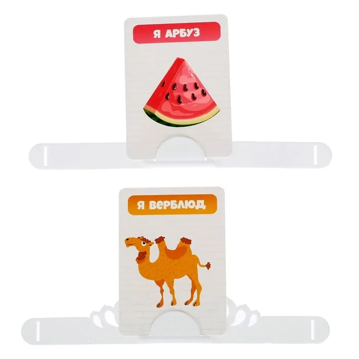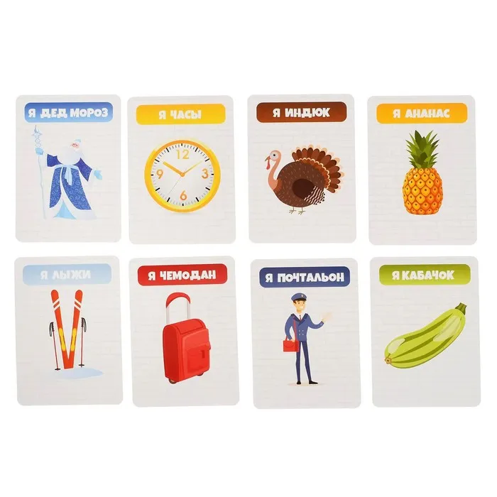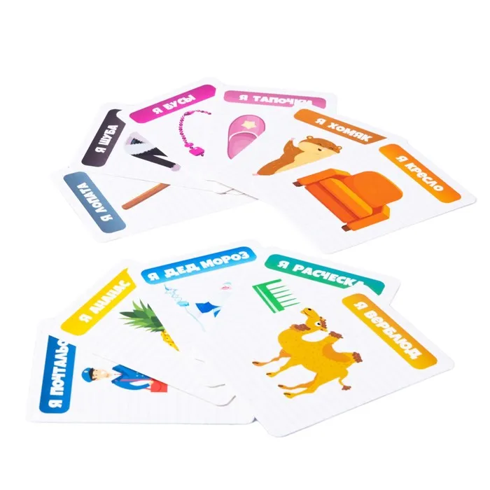 Правила игры: 1. Перемешайте карточки и выложите на стол рисунками вниз. Вытяните случайную карту и поместите на диадемку-держатель. 2. Переверните песочные часы и начните задавать вопросы, на которые можно ответить «да» или «нет». 3. Если справились за минуту – возьмите новую карточку. Ход переходит к следующему участнику. 4. Игра идет, пока не закончатся все карточки. Победителем признается участник, собравший больше всех карточек.