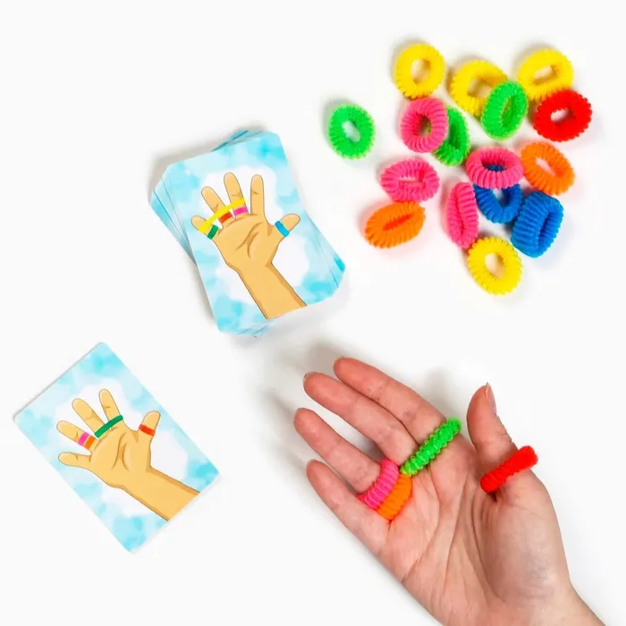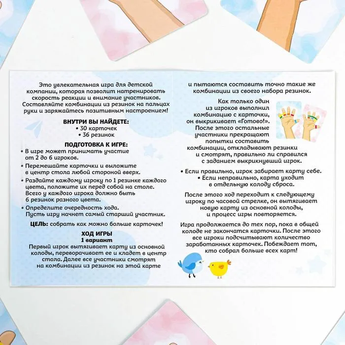 Это весёлая семейная игра для самых быстрых и внимательных! На каждой карточке вы найдёте забавные комбинации из резинок, которые нужно составлять на пальцах руки. Собирайтесь всей семьёй или компанией друзей и устраивайте соревнования на скорость!