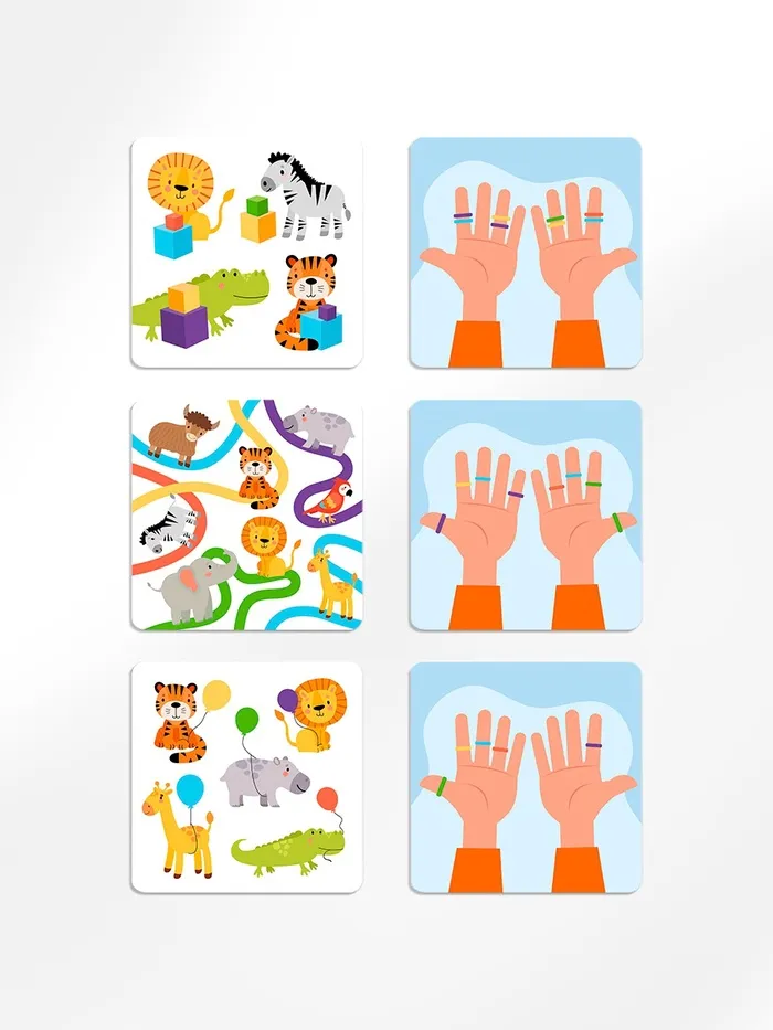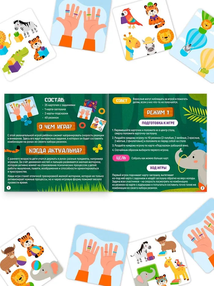 Задача игроков — собрать как можно больше выполненных карточек. А сделать это помогут резиночки на пальцах. На карточках изображены различные комбинации, которые нужно воспроизвести на пальцах с помощью резинок. Как только игрок справился с заданием, он громко объявляет: “Готово!”. И начинается проверка: