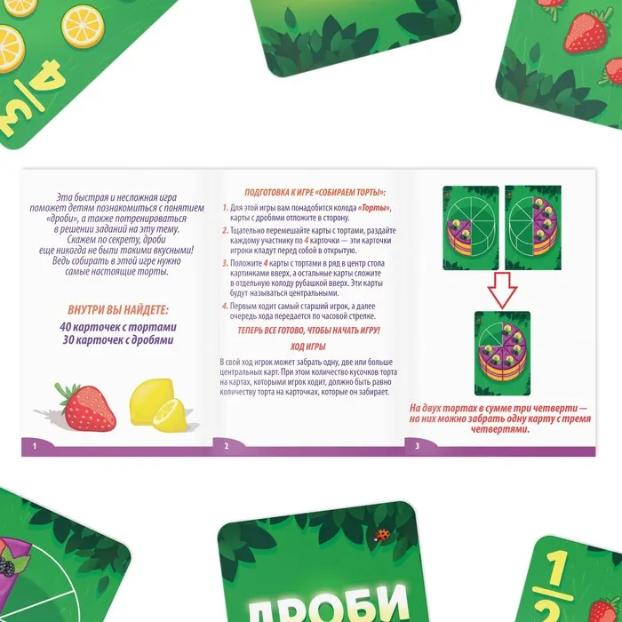 - «Ищем дроби»: участникам предстоит искать карты с тортиками, которые соответствуют какой-либо из его карт с дробями.