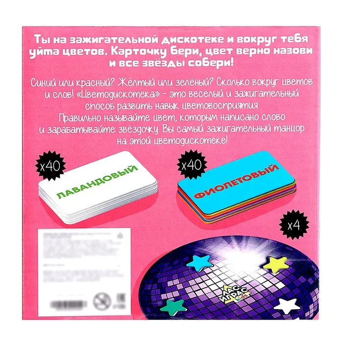 Посетите зажигательную вечеринку в настольной игре «Цветодискотека»! Диско-шары светят множеством разных цветов. Сможете ли вы не запутаться и правильно определить цвета с карточек?