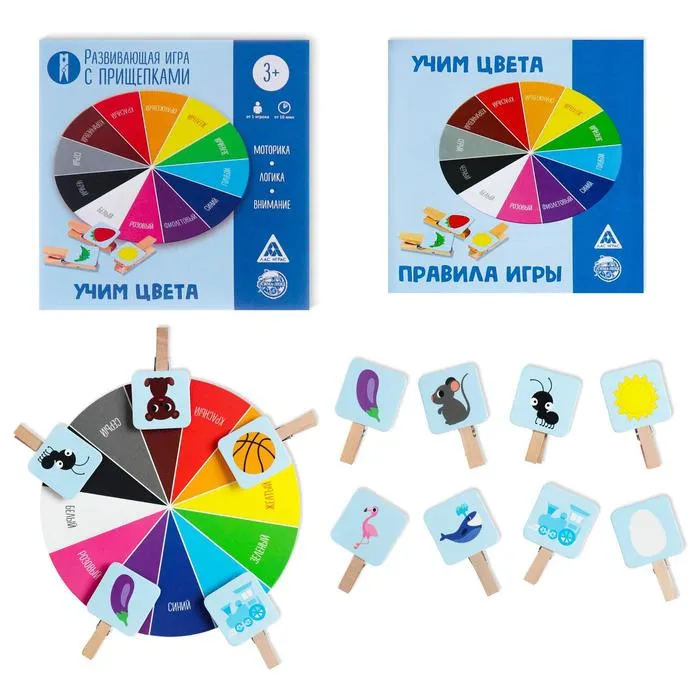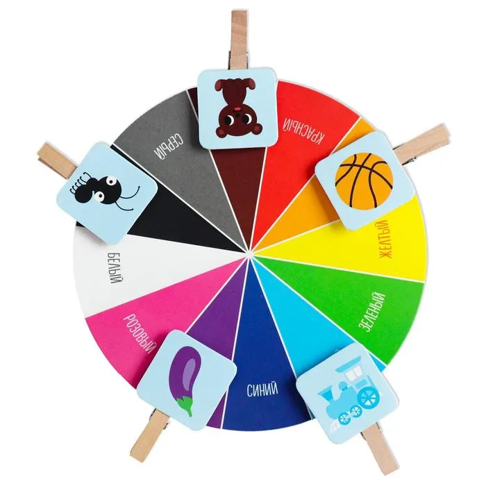 Каждый сектор имеет свой цвет, а всего их 12. На прищепках находятся предметы или животные того или иного оттенка. На каждый сектор приходится только одна прищепка.