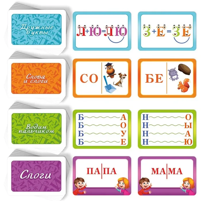 В коробке вас ждёт 4 типа заданий, направленных на знакомство со звуками, буквами и слогами. Они помогут сделать занятия весёлыми и интересными, а также быстро научат ребёнка самому главному и сложному — чтению.