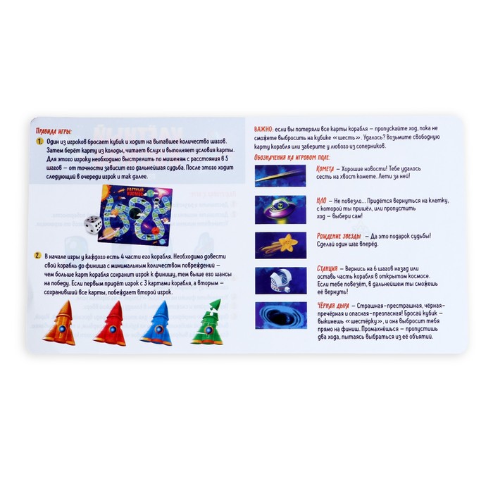 Эта настольная игра отправит малыша в настоящее космическое путешествие. Ребёнку предстоит уворачиваться от метеоритных дождей и не попасть в чёрную дыру! Не забудьте проверить, заряжен ли бластер? Ведь бить по мишеням придётся метко.