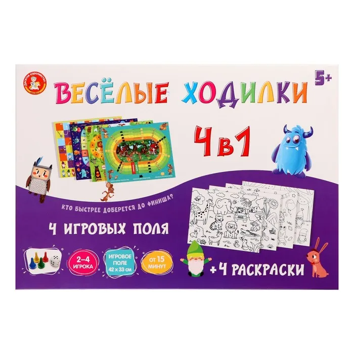 Настольная игра для детей «Весёлые ходилки» 4 в 1 - это целый набор игр для интересного досуга. В него входит 4 настольных игры-ходилки: «Кошки-мышки», «Прогулка по зоопарку», «Гномы в доме» и «Монстрики» и 4 раскраски-иллюстрации к каждой игре.