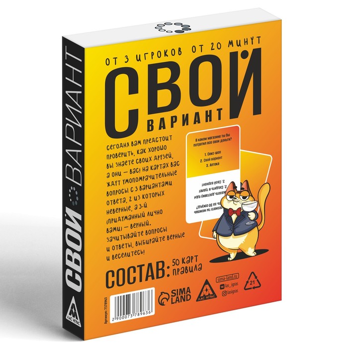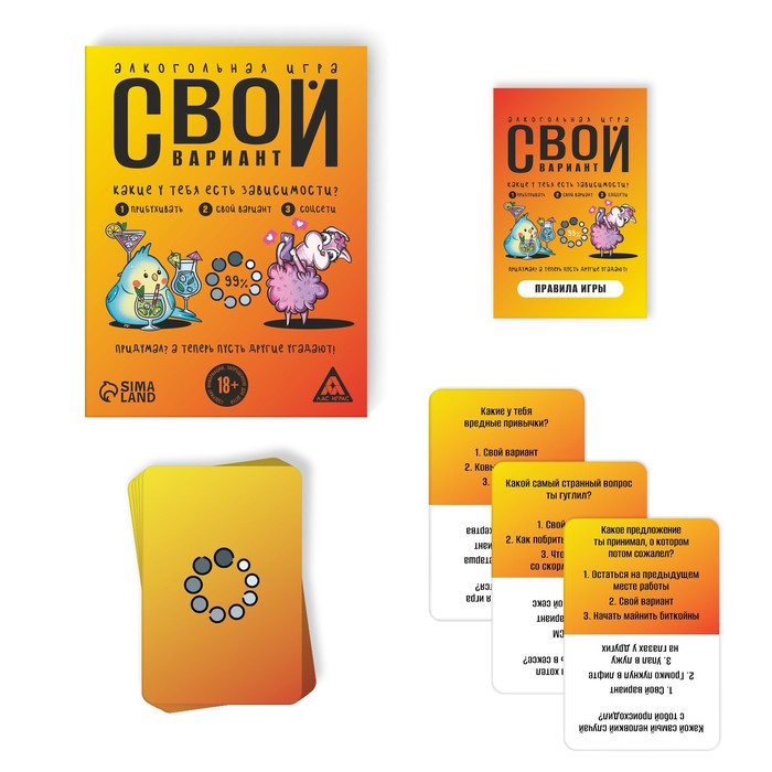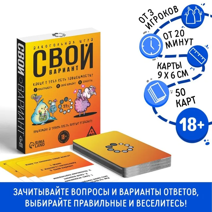 Сегодня вам предстоит проверить, как хорошо вы знаете своих друзей, а они – вас! На картах вас ждут умопомрачительные вопросы с 3 вариантами ответа, 2 из которых неверные, а 3-й (придуманный лично вами) – верный. Зачитывайте вопросы и варианты ответов, выбирайте верные ответы и веселитесь!