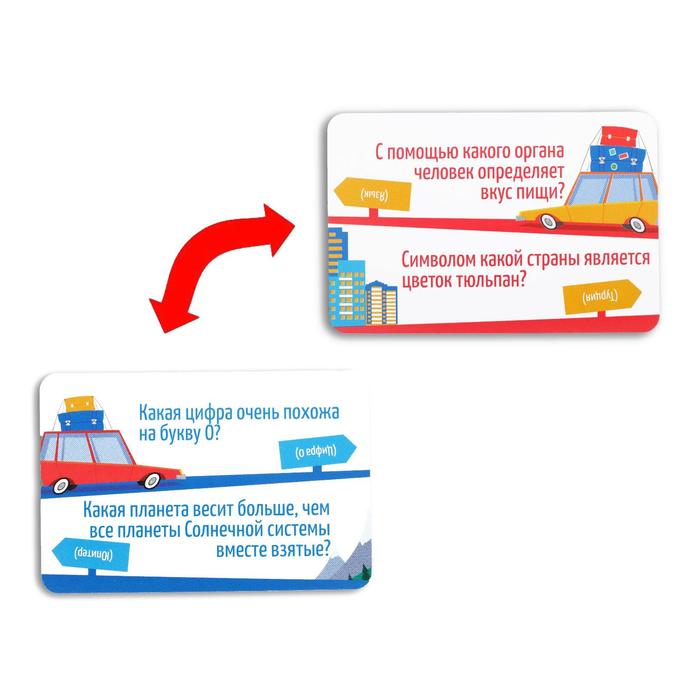 Вас ждут карточки, на каждой стороне которых расположились 2 вопроса. Если участники играют командами, то зачитывать вопросы нужно своей команде, а если каждый сам за себя — то игроку слева.