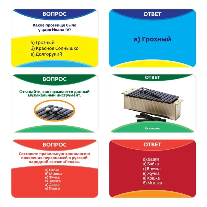 - «Ответь на вопрос» — самые простые, в которых участникам нужно выбрать один вариант ответа. Правильный приносит 1 очко.