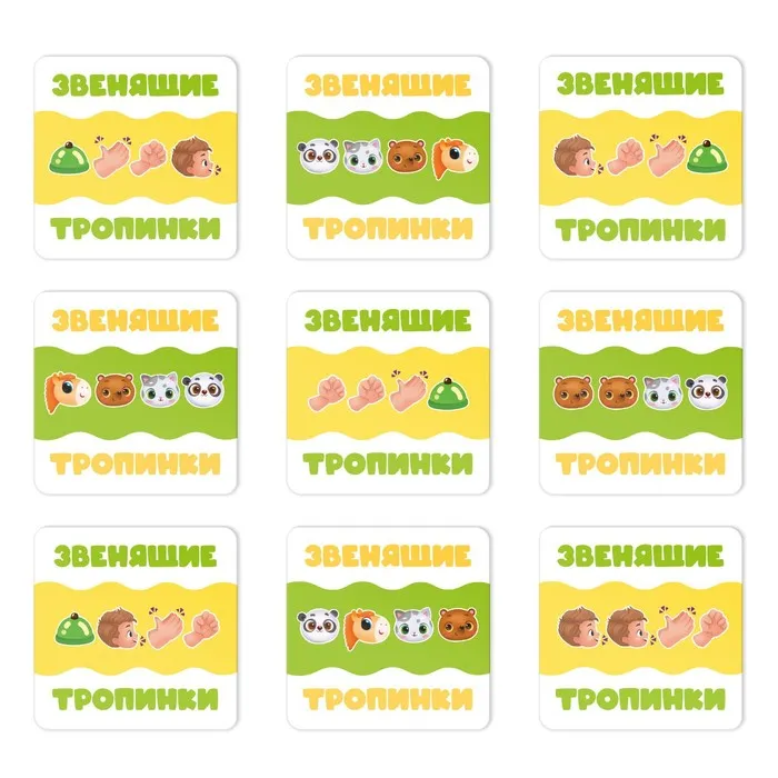 Разложите на столе все карточки «Звенящиие тропинки» рубашкой вверх. Начинает самый младший игрок. Он выбирает карточку, не трогая и не называя её. Затем воспроизводит порядок звуков всем участникам с помощью звоночка. Задача остальных игроков: раньше всех найти правильную карточку и положить на неё руку. Побеждает тот, кто собрал больше карточек.