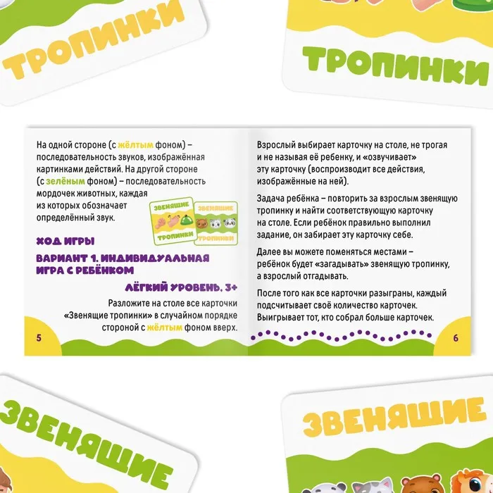 Перед вами не просто игра, а полезное пособие, с помощью которого ребёнок научится воспринимать информацию зрительно и на слух. На карточках изображены определённые последовательности звуков — их нужно воспроизвести. Предусмотрено 3 уровня сложности и 2 способа игры.