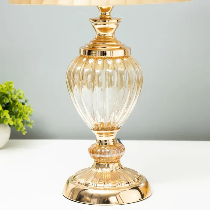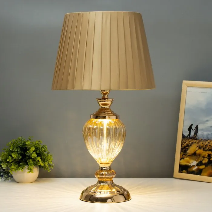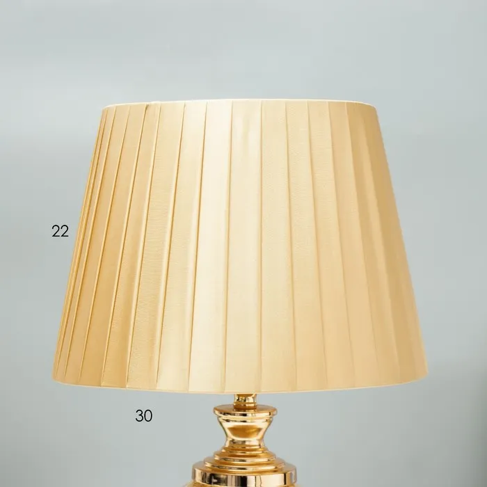 - Металлическое основание и текстильный плафон в золотом цвете придают лампе роскошный вид.