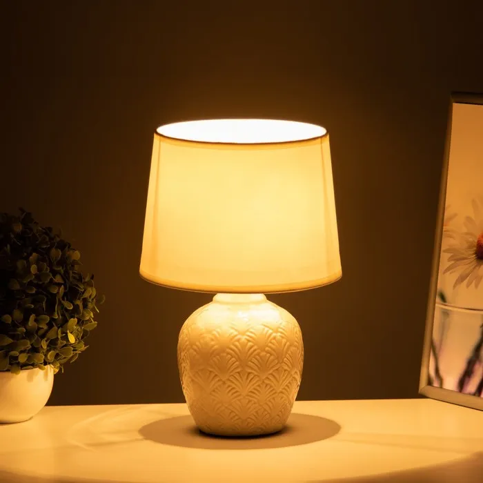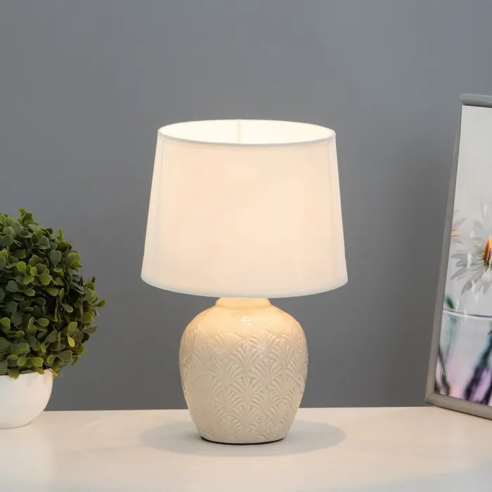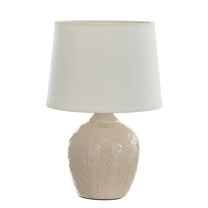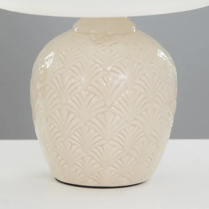 Эта настольная лампа станет отличным акцентом в вашем интерьере, добавляя уют и стиль в любое помещение. Бежевое керамическое основание и белый текстильный абажур в конусной форме создают гармоничное сочетание, которое прекрасно впишется в классический или современный стиль.