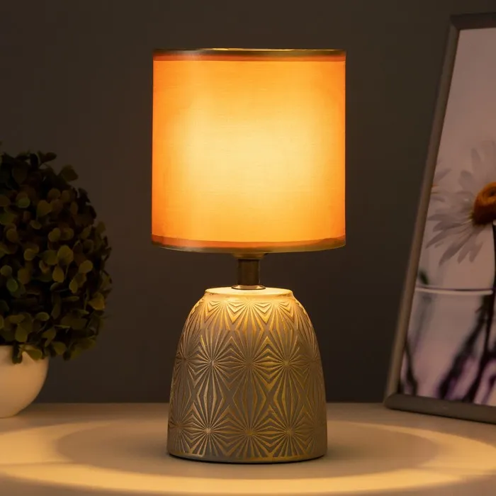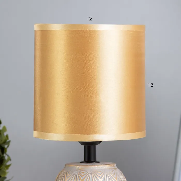 - Текстильный абажур в золотых оттенках создает теплую атмосферу.