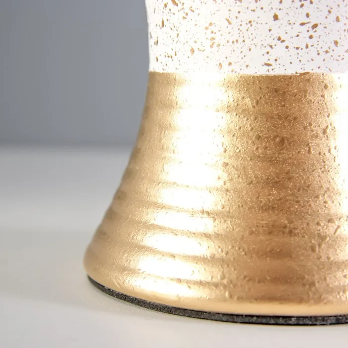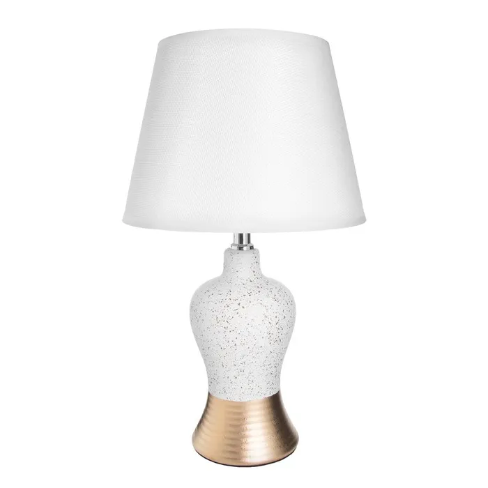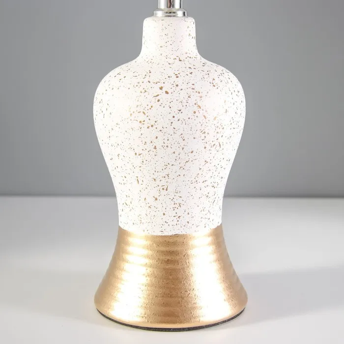 Эта настольная лампа станет стильным акцентом в вашем интерьере, добавляя нотки современного шика и элегантности. С высотой 30 см и размерами 22×22 см, она идеально подходит для рабочего стола или прикроватной тумбочки. Золотое и белое керамическое основание в сочетании с текстильным абажуром создает гармоничное и изысканное освещение, идеально подходящее для создания уютной атмосферы.
