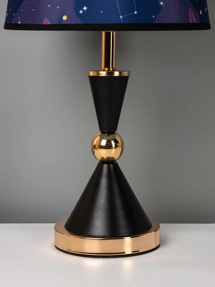 Соразмерный и выразительный силуэт: Высота 35 см и ширина 24 см обеспечивают устойчивость и заметность на столе, тумбе или полке. Фигурная форма основания добавляет индивидуальность, не нарушая лаконичности дизайна. Синий абажур в тёмных тонах подчёркивает контрастную гамму, не перегружая пространство. Это не просто источник света – это элемент интерьера, который работает как акцент. Подходит для спальни, кабинета или гостиной, где важны чёткие линии, контрастные сочетания и умеренная выразительность.