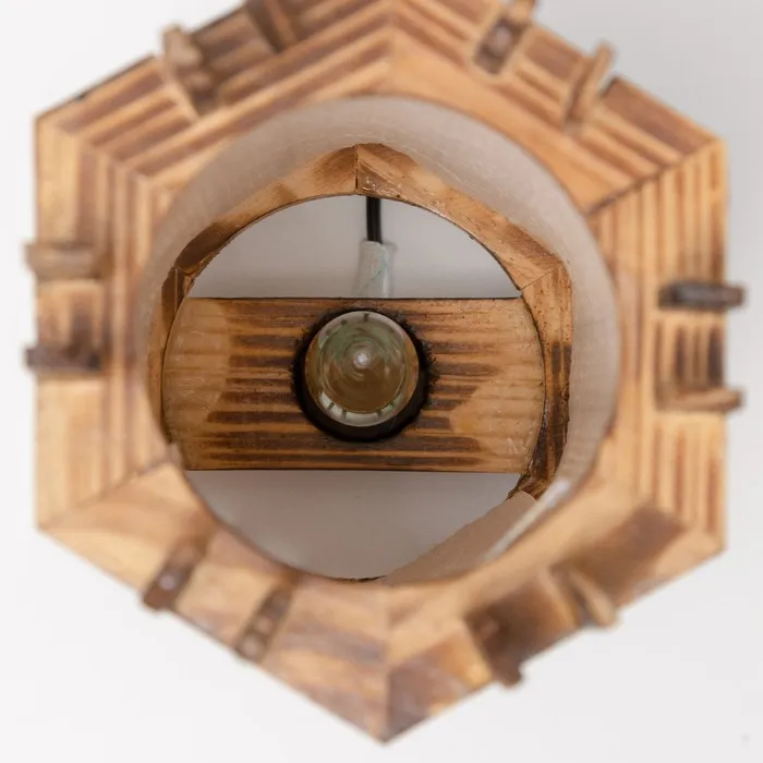 - Цилиндрический плафон из дерева мягко рассекает свет вверх, создавая уютный световой поток.