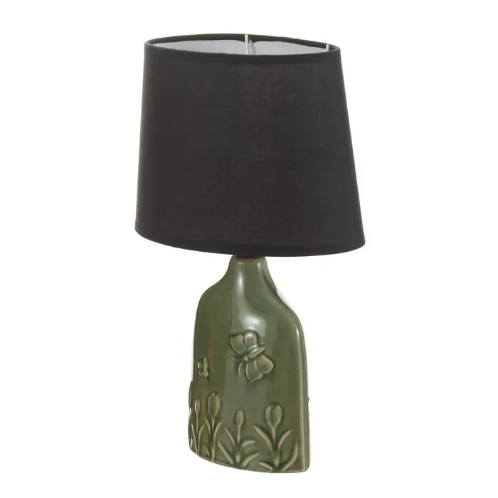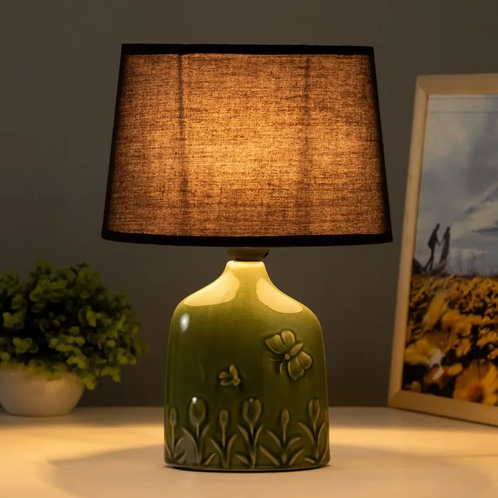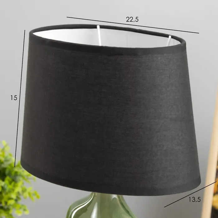 Эта настольная лампа с оригинальным дизайном станет ярким акцентом в вашем интерьере. Зеленое керамическое основание и текстильный абажур в темных тонах создают стильное сочетание, которое отлично впишется в любое пространство и добавит ему уюта.