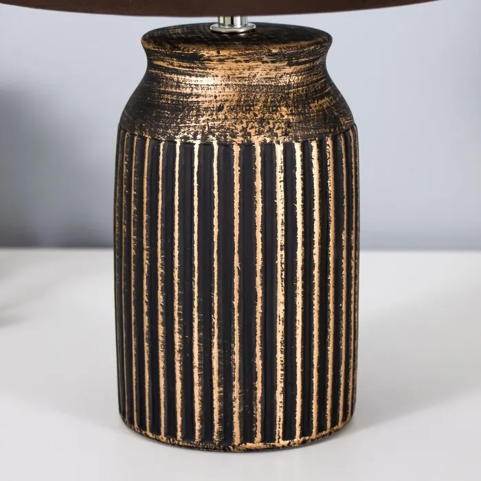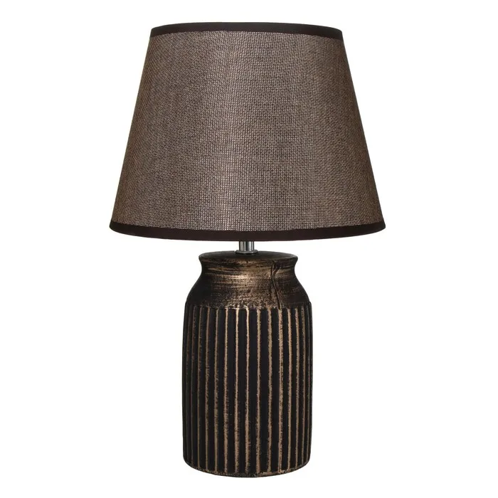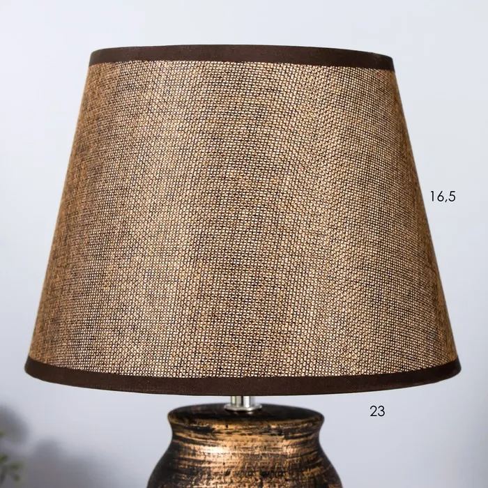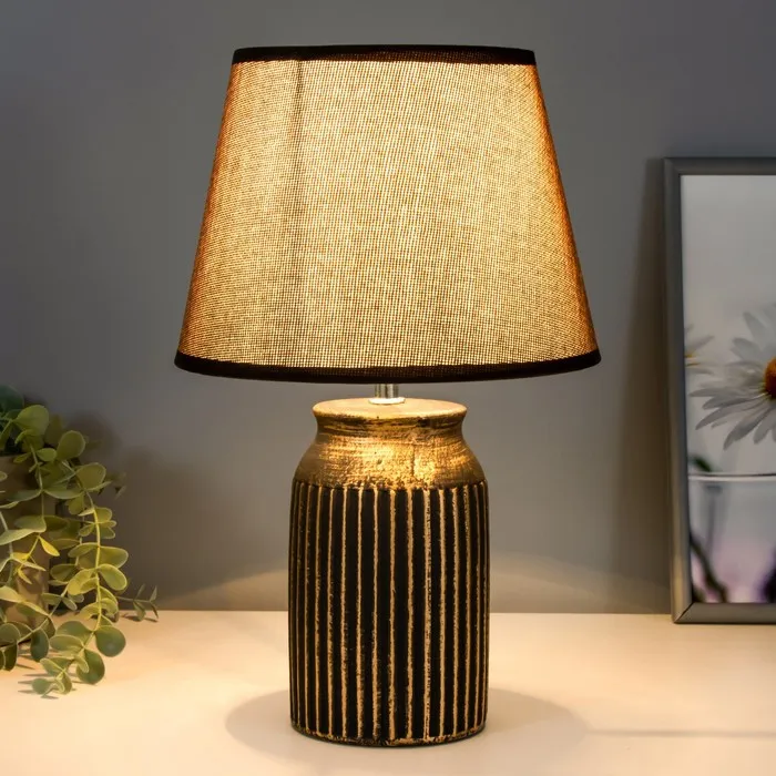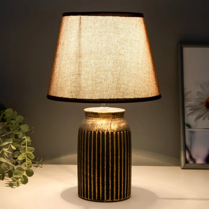 - Текстильный абажур с темными тонами мягко рассеивает свет, обеспечивая комфортное освещение.