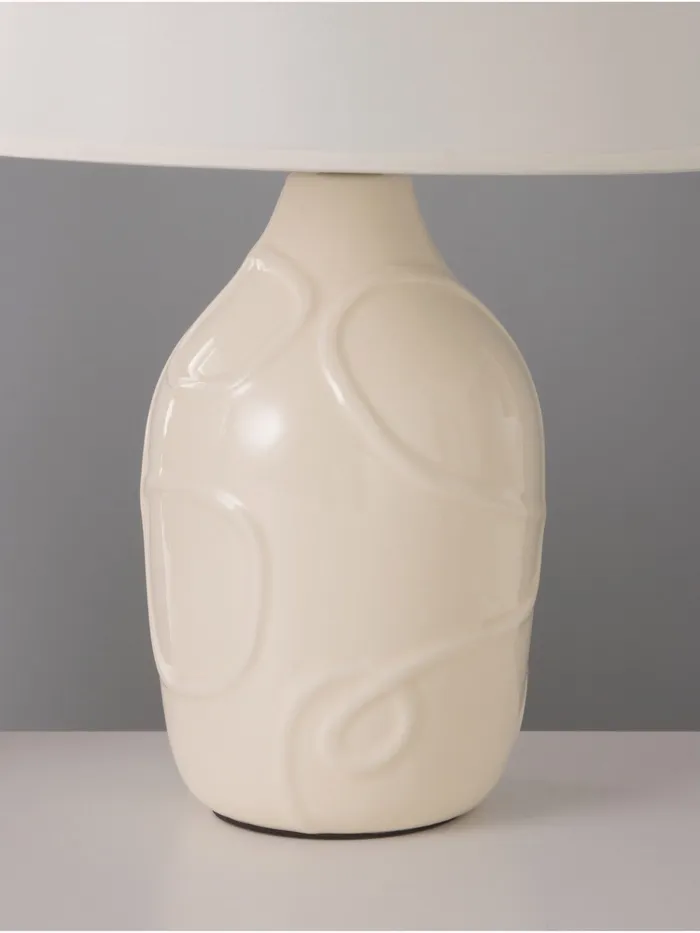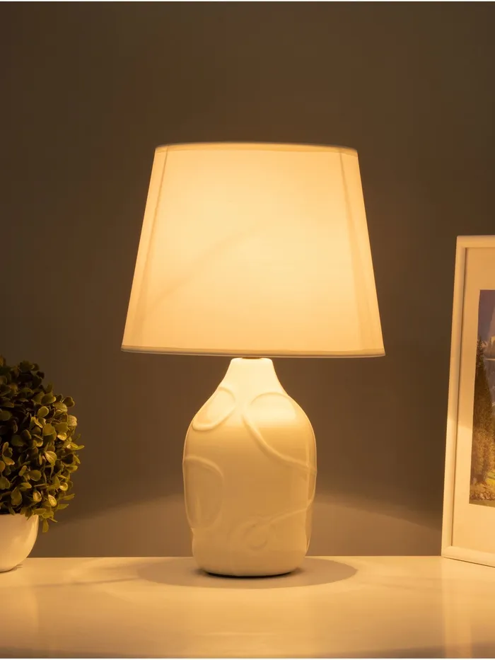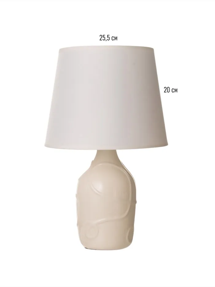 - Современный дизайн: Бежевое керамическое основание в сочетании со светлым абажуром из текстиля и пластика придает светильнику стильный и актуальный вид.