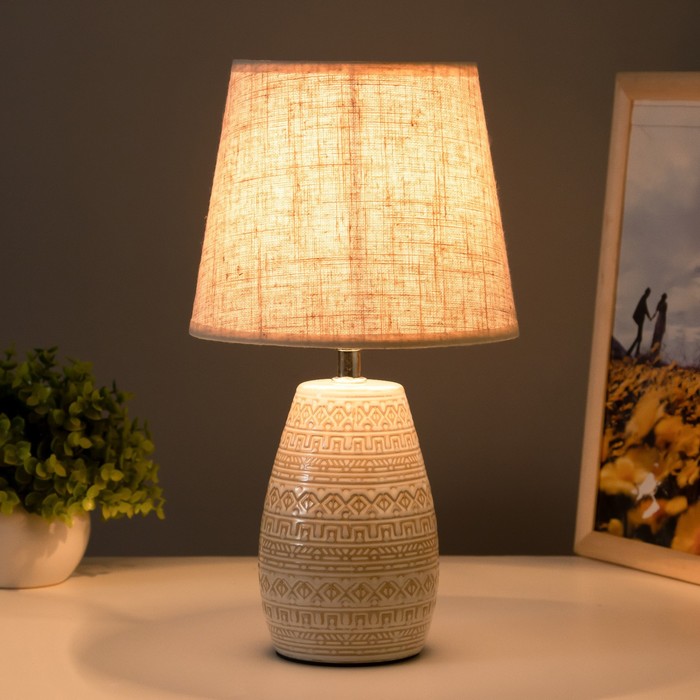 Эта настольная лампа с текстильным абажуром станет прекрасным дополнением вашего интерьера, придавая ему уют и стиль. С её бежевым керамическим основанием и конусным плафоном, она идеально подходит для создания теплой атмосферы в спальне, гостиной или офисе.