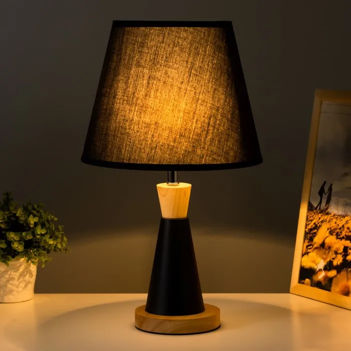 - Конусный абажур в темных тонах мягко рассеивает свет, создавая приятное освещение.