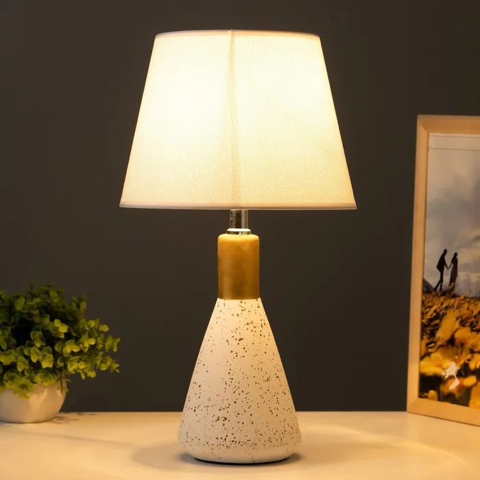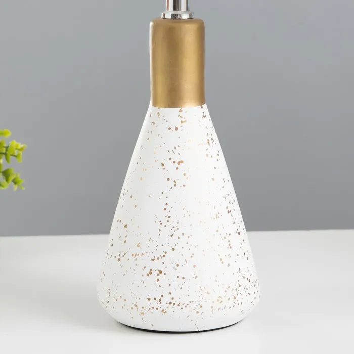Эта настольная лампа станет стильным акцентом в вашем интерьере, сочетая элегантность и функциональность. С золотым и белым керамическим основанием и конусным текстильным абажуром, она идеально освещает пространство, создавая уютную атмосферу.