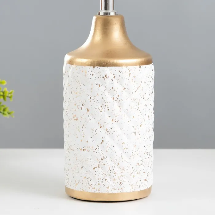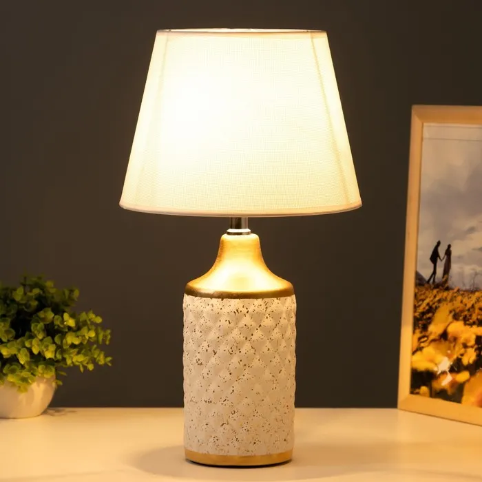 Эта настольная лампа станет изысканным акцентом в вашем интерьере. Бело-золотое оформление и текстильный абажур создают атмосферу уюта и элегантности, а мягкий свет наполняет пространство теплом.