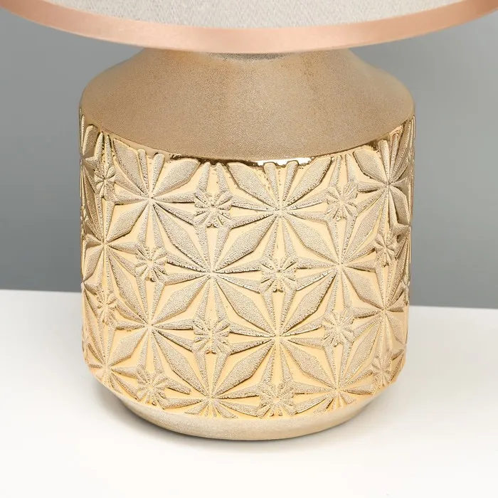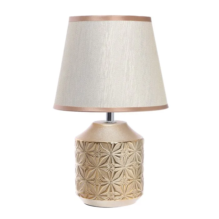 Эта стильная настольная лампа станет идеальным дополнением вашего интерьера. Золотое керамическое основание и текстильный абажур создают атмосферу уюта и элегантности, а мягкий свет наполняет пространство комфортом.