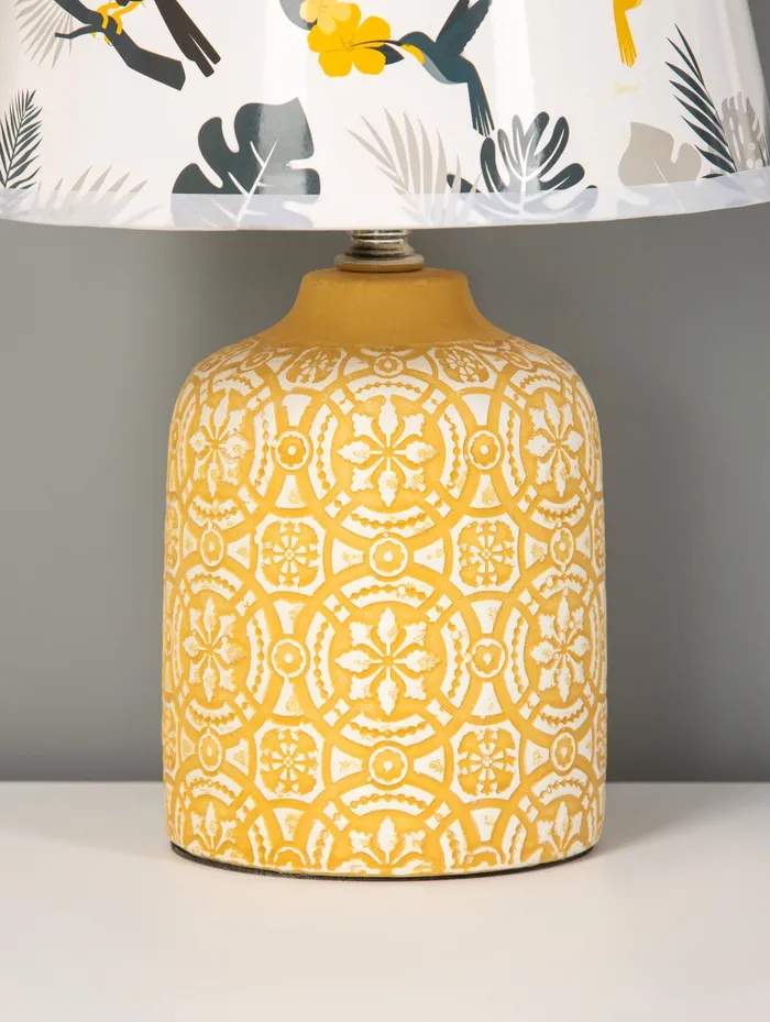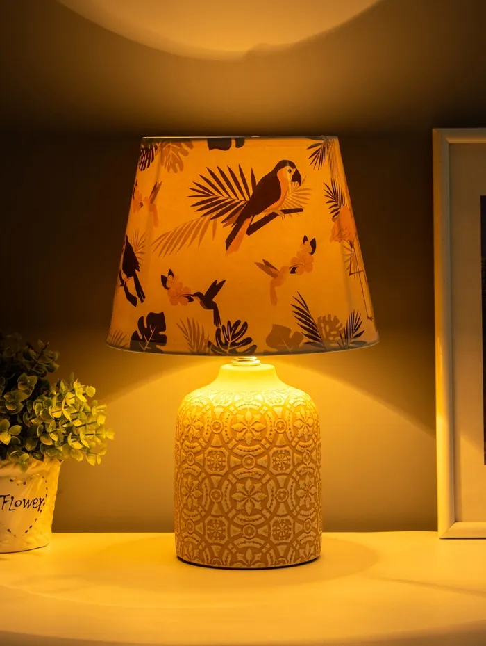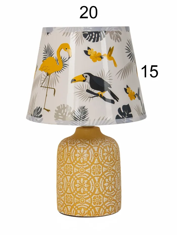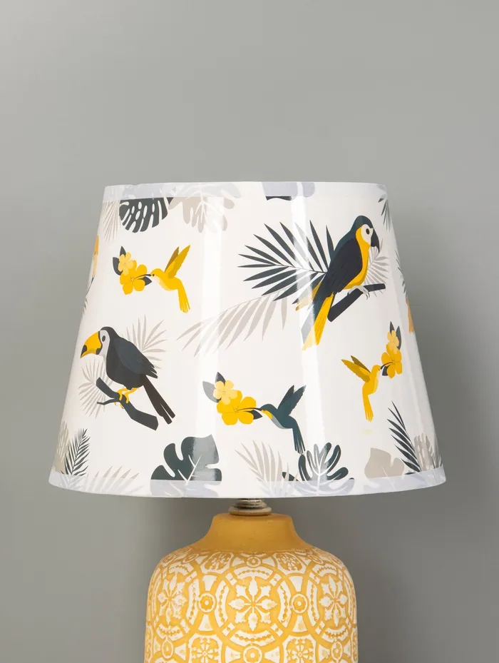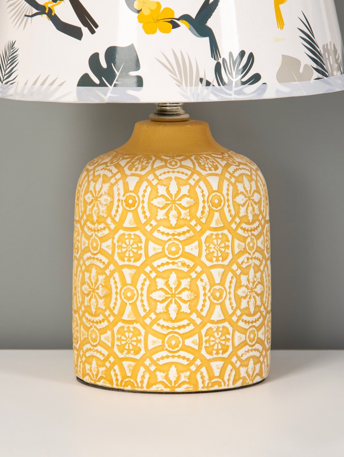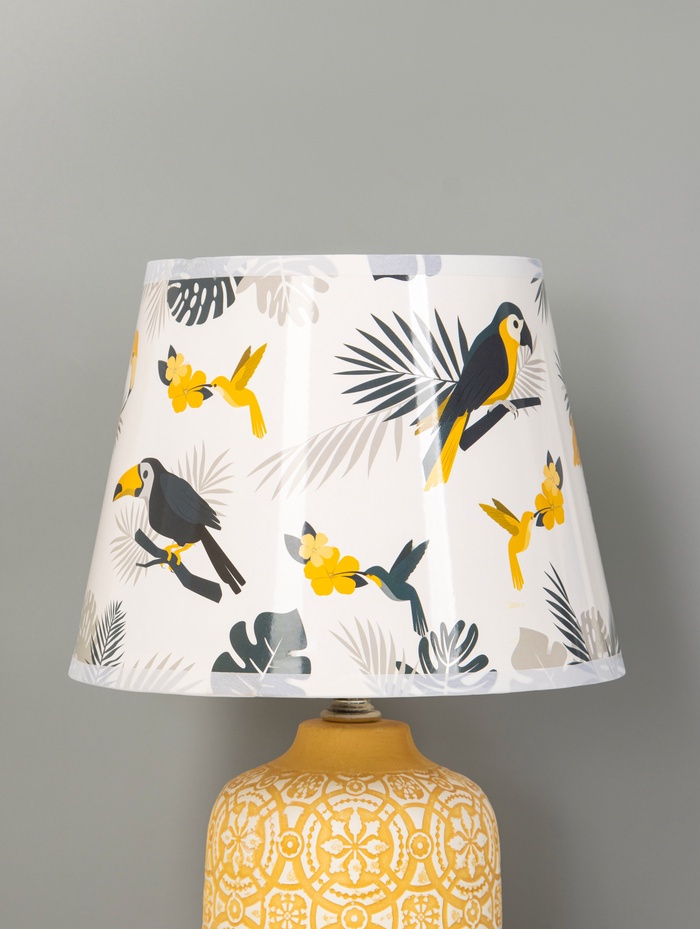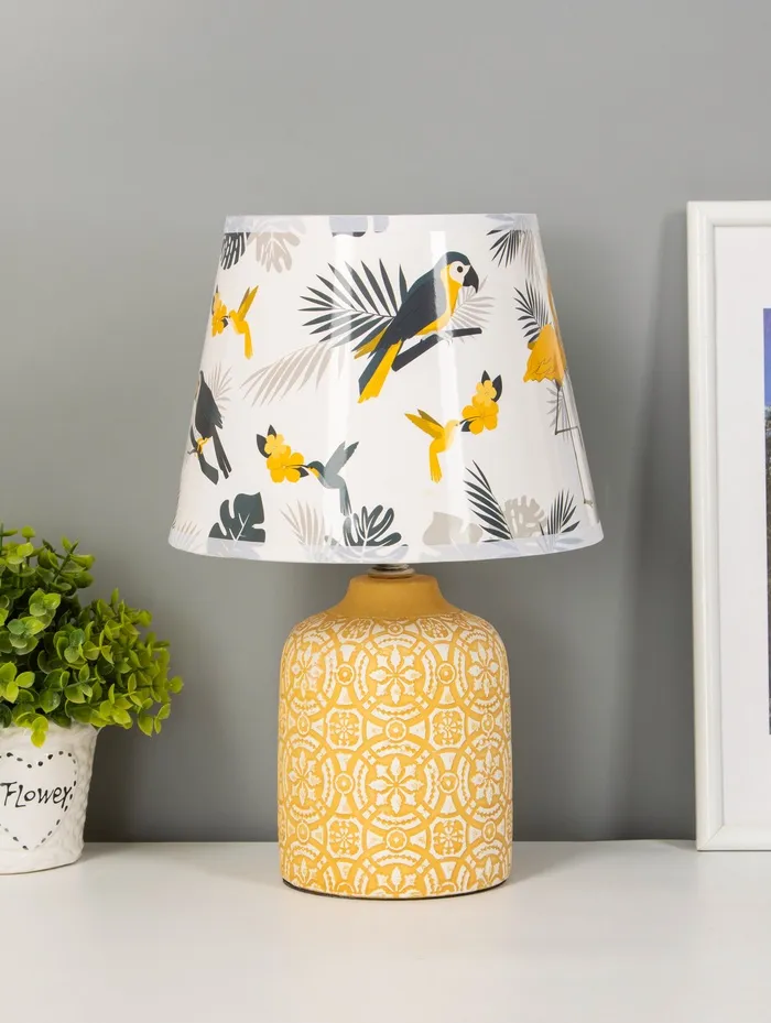 - Тёплая основа с характером: Основание из керамики жёлтого цвета выглядит плотно и фактурно. Оно не просто держит конструкцию — добавляет визуальной тяжести, балансируя воздушность абажура.