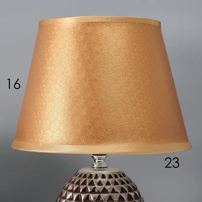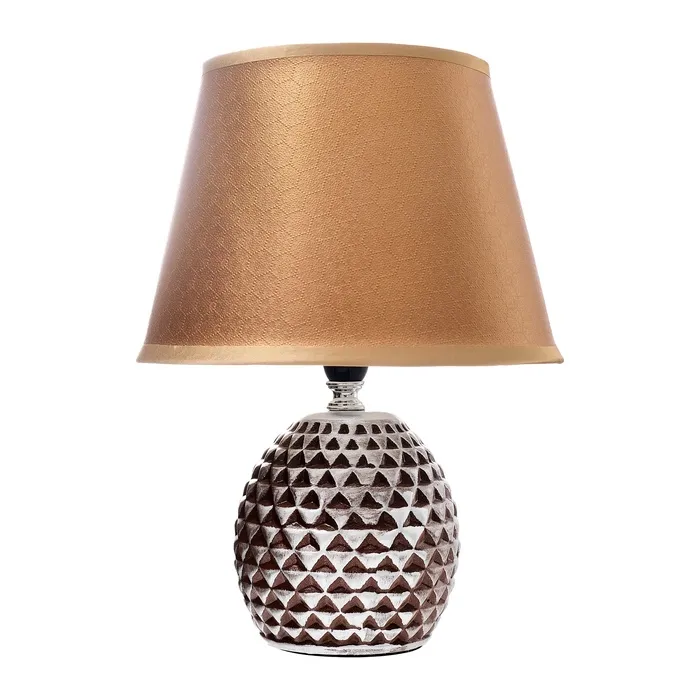 Эта настольная лампа с текстильным абажуром станет стильным акцентом в вашем интерьере. Высота 31,5 см и размеры 22,5×22,5 см позволяют разместить её в любом уголке вашего дома — от рабочего стола до прикроватной тумбочки. Коричневое керамическое основание придаёт изделию прочность, а золотистый абажур добавляет элегантности и создает мягкий свет.