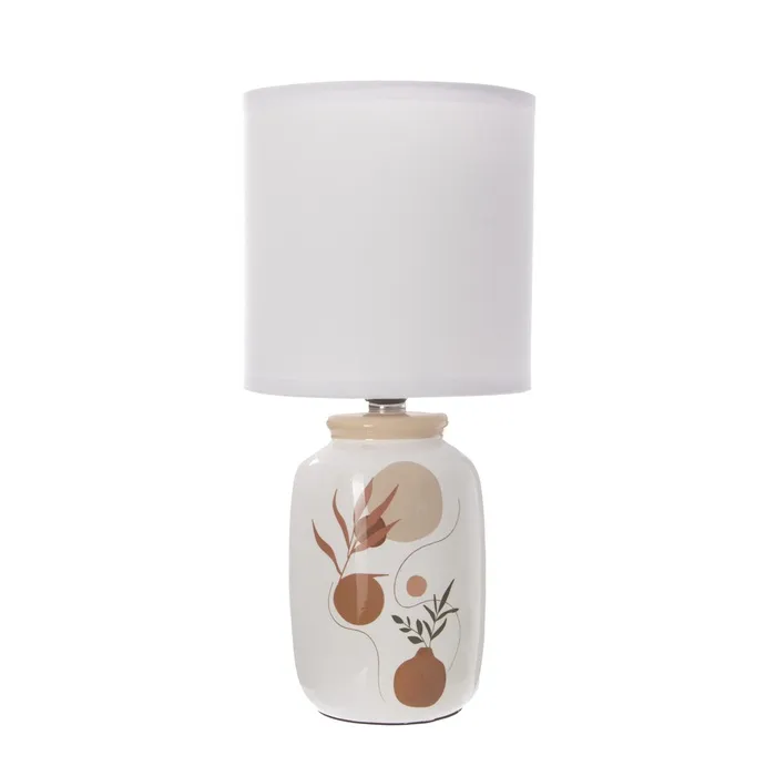 Эта настольная лампа станет отличным дополнением вашего интерьера, привнося уют и стиль в любое помещение. С белым керамическим основанием и цилиндрическим абажуром, выполненным в светлых тонах, она идеально подходит для создания комфортной атмосферы.