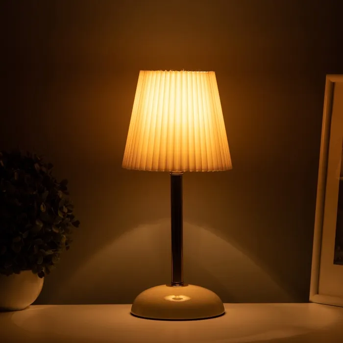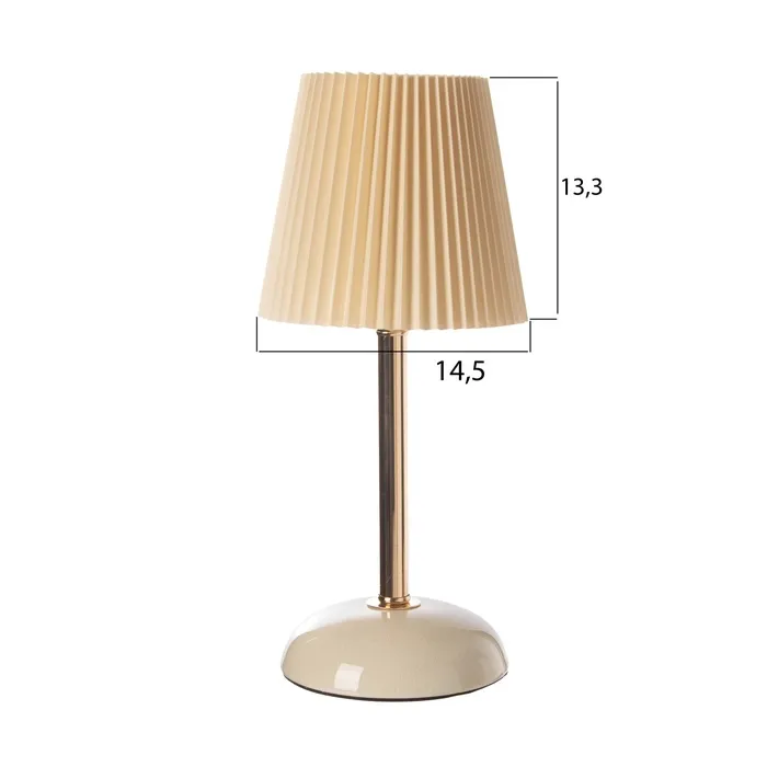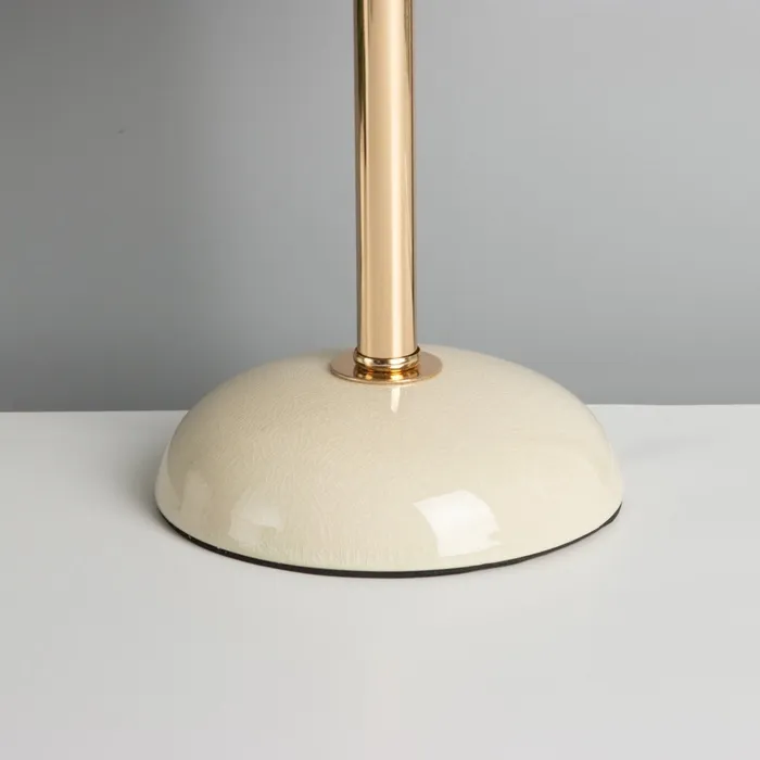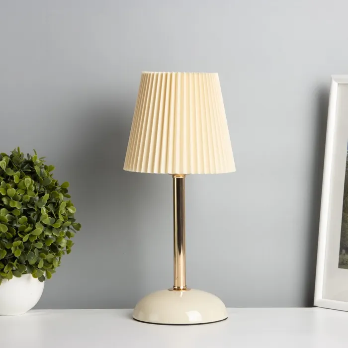 Эта настольная лампа с элегантным абажуром станет отличным дополнением вашего интерьера. Сочетание белого и золотого цветов придаёт ей стильный вид, а компактные размеры позволяют удобно разместить её на столе или тумбочке.