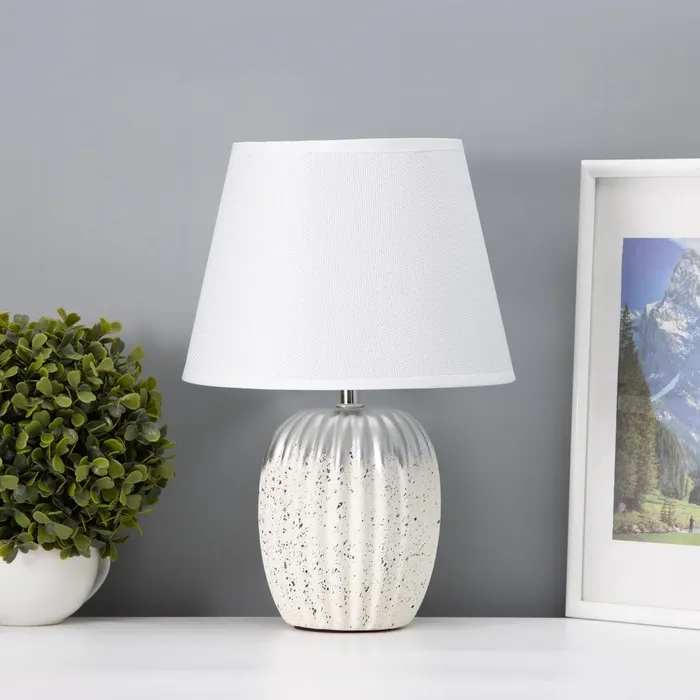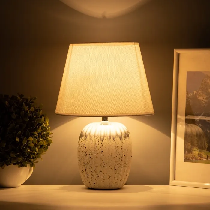 Элегантная настольная лампа с белым керамическим основанием и текстильным абажуром станет стильным акцентом вашего интерьера. Она создаёт мягкое освещение, добавляя атмосферу уюта и спокойствия в любое пространство.