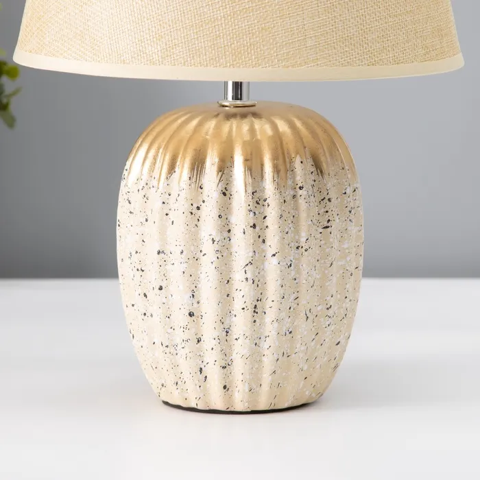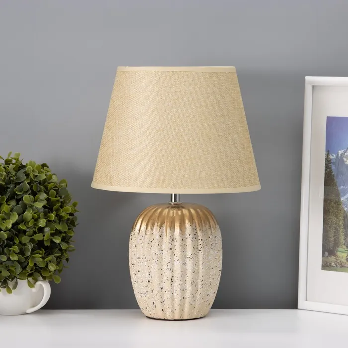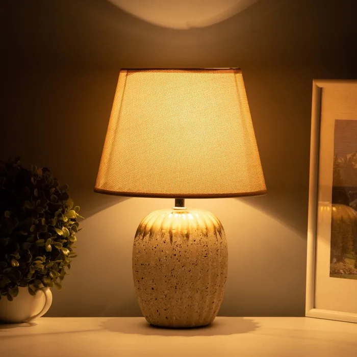Элегантная настольная лампа с бежевым керамическим основанием и текстильным абажуром привнесёт уют и стиль в ваш интерьер. Эта лампа создаёт мягкое освещение, добавляя атмосферу спокойствия и комфорта.