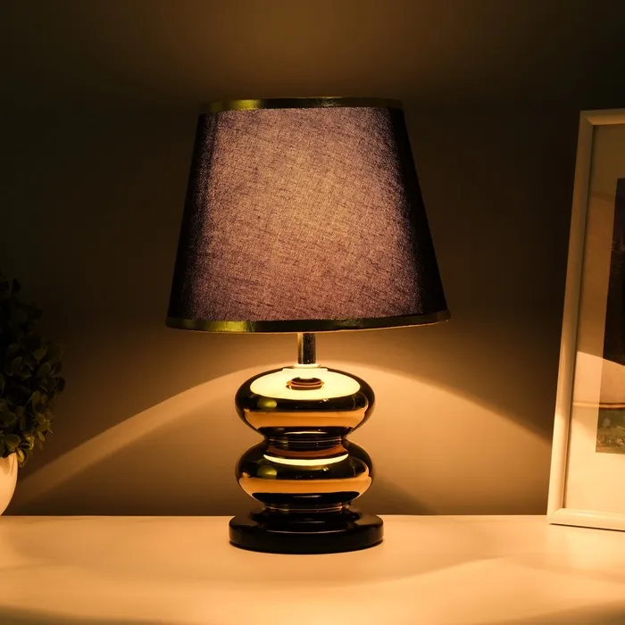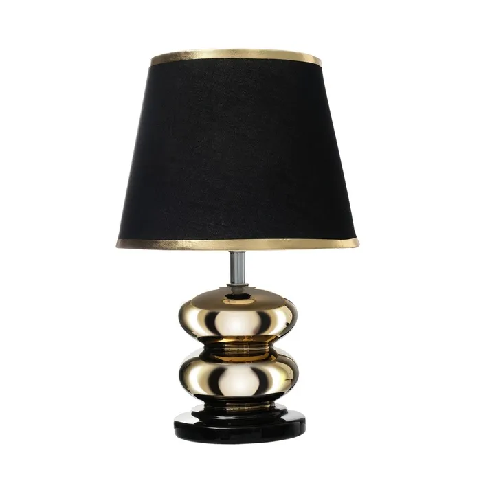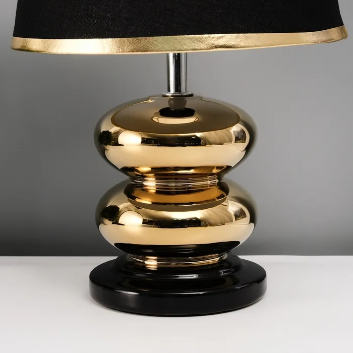 Эта настольная лампа с керамическим основанием золотого цвета и черным текстильным абажуром станет стильным акцентом в вашем интерьере. Высота 32 см и ширина 20 см делают её идеальным выбором для размещения на столе или тумбочке. Лампа создает мягкий свет, подходящий для чтения или создания уютной атмосферы.
