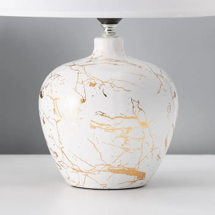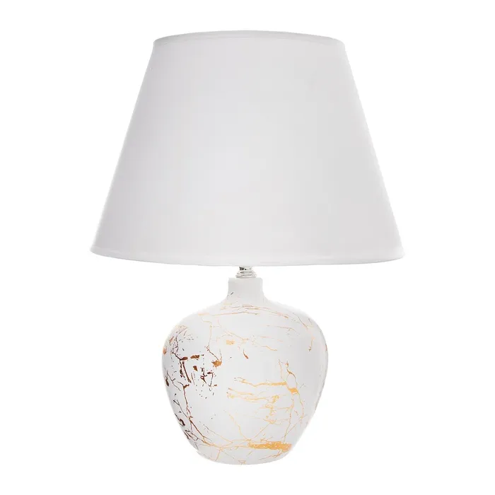 Эта настольная лампа с текстильным абажуром станет стильным акцентом в вашем интерьере. С высотой 39,5 см и размерами 30×30 см, она идеально подходит для освещения столов, тумб или полок. Керамическое основание белого цвета в сочетании с золотыми элементами придаёт ей изысканный вид, а светлые оттенки абажура создают мягкое и комфортное освещение.
