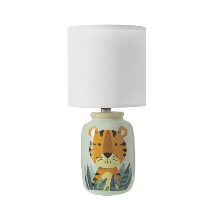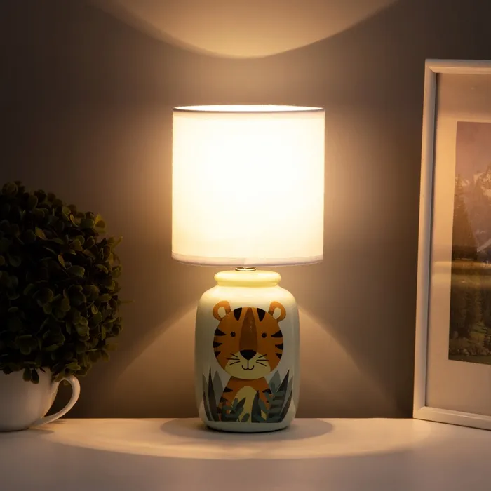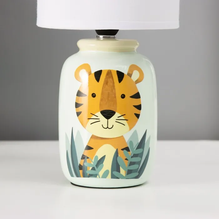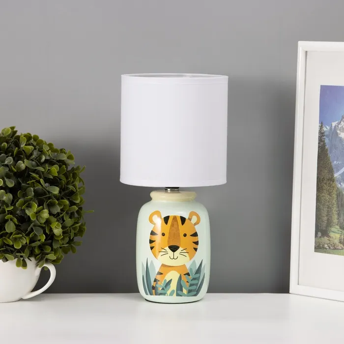 Эта яркая настольная лампа с абажуром в форме тигра станет отличным дополнением детской комнаты. С высотой 27 см и компактными размерами 13×13 см, она прекрасно впишется на стол или тумбочку, создавая уютную атмосферу для игр и учёбы. Зеленое керамическое основание придаёт изделию игривый вид, а светлый цилиндрический абажур мягко рассеивает свет, обеспечивая комфортное освещение.