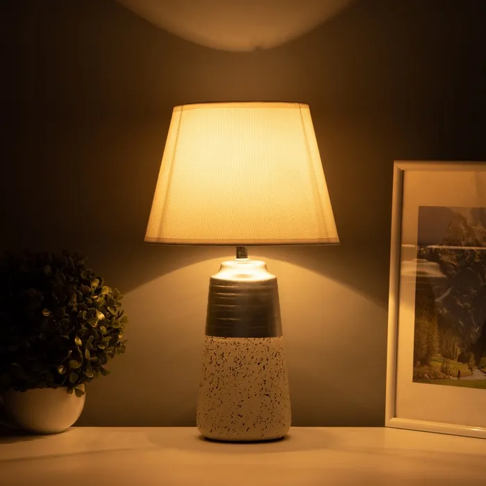Эта настольная лампа в белом цвете станет отличным дополнением вашего интерьера. С высотой 39 см и размерами 22×22 см, она идеально подходит для любого уголка вашего дома — от рабочего стола до прикроватной тумбочки. Керамическое основание и текстильный абажур в форме трапеции создают атмосферу уюта и гармонии.