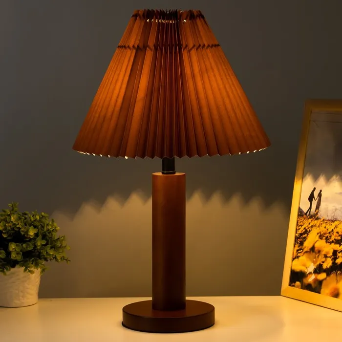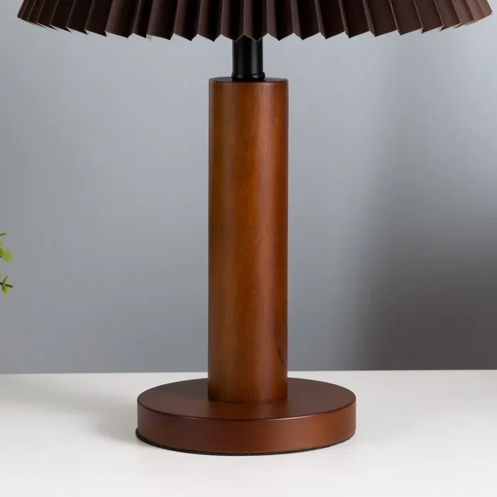 - Металлическое и деревянное основание обеспечивает надежность и долговечность, а конусный абажур из текстиля создает мягкий и приятный свет.