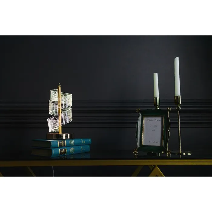 Эта настольная лампа с оригинальным дизайном станет стильным дополнением вашего интерьера. С размерами 11×11 см и высотой 25 см, она идеально подходит для рабочего стола или прикроватной тумбочки. Золотое металлическое основание в сочетании с легким пластиковым плафоном придаёт ей современный вид, который легко вписывается в любой стиль оформления.