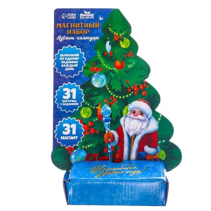 Размер ёлочки 19 х 7 х 27 см31 ёлочная игрушка-магнит в наборе.Так же вы найдёте 31 новогоднее задание для весёлых каникул!Подставкой для ёлочки служит маленький ящик, в котором удобно хранить все магнитики!Как играть: