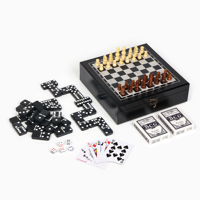 Набор состоит из 3 видов игр: лото, домино и шашки. Особенностью набора является то, что для каждой игры созданы свои персональные фишки и поля.