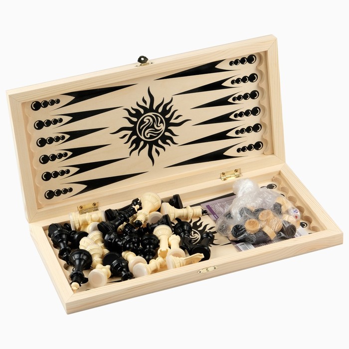 Набор состоит из 3 видов игр: шахматы, нарды и шашки. Особенностью набора является то, что для каждой игры созданы свои персональные фишки и поля.