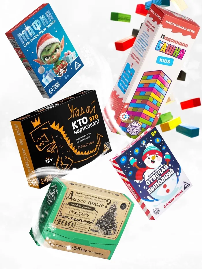 Внутри собрано 8 увлекательных игр, каждая из которых подарит новогоднее настроение, атмосферу праздника и возможность стать участниками небольших соревнований на скорость, внимательность и объяснение слов.