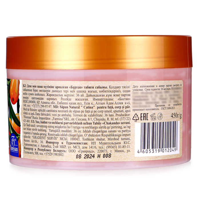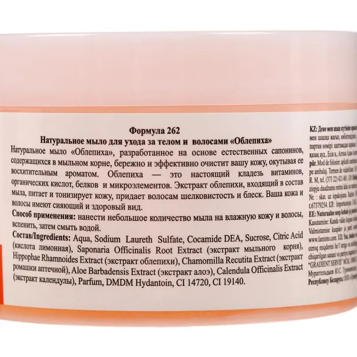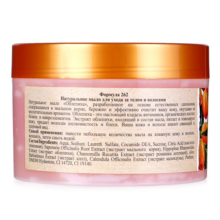 Описание: натуральное мыло для ухода за телом и волосами "Облепиха", 450 г. Натуральное мыло «Облепиха», разработанное на основе естественных сапонинов, содержащихся в мыльном корне, бережно и эффективно очистит вашу кожу, окутывая ее восхитительным ароматом. Облепиха — это настоящий кладезь витаминов, органических кислот, белков и микроэлементов. Экстракт облепихи, входящий в состав мыла, питает и тонизирует кожу, придает волосам шелковистость и блеск. Ваша кожа и волосы имеют сияющий и здоровый вид.