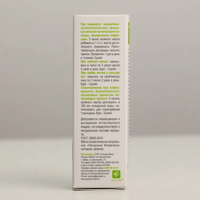 Спринцевание при воспалительных, инфекционных, опухолевых процессах мочеполовых органов: 5 капель зелёного масла растворить в 100 мл очищенной воды (использовать для спринцевания).