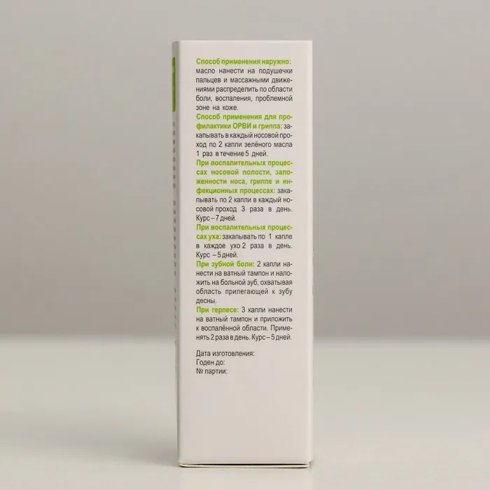 Способ применения для профилактики ОРВИ и гриппа: по 2 капли зелёного масла закапывать в каждый носовой проход 1 раз в день.