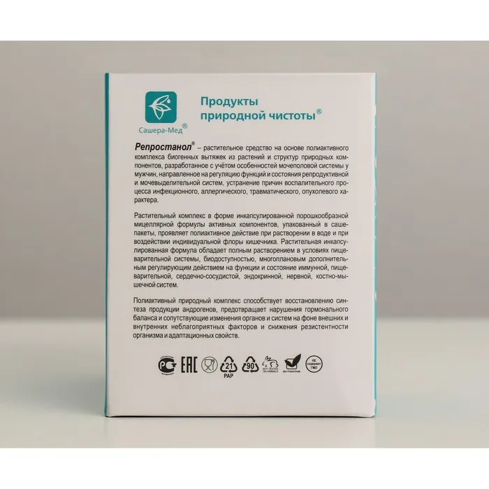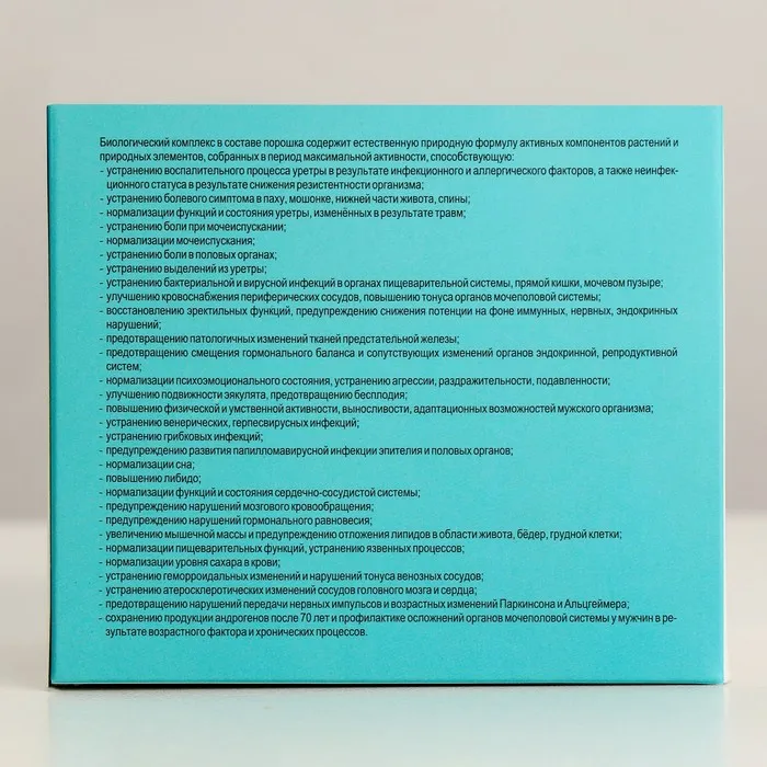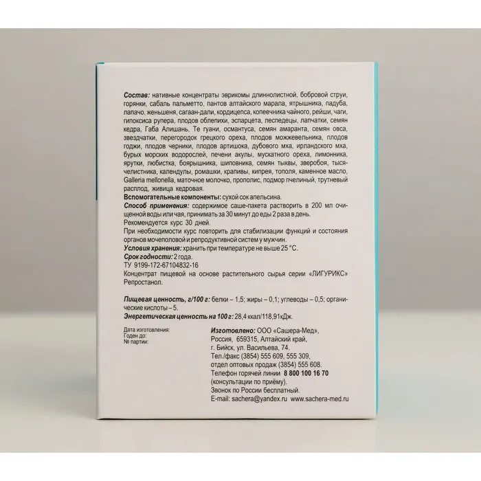 Способ применения: содержимое саше-пакета растворить в 200 мл очищенной воды или чая, принимать за 30 минут до еды 2 раза в день. Рекомендуется курс – 30 дней. При необходимости курс повторить для стабилизации функций и состояния органов мочеполовой и репродуктивной систем у мужчин.